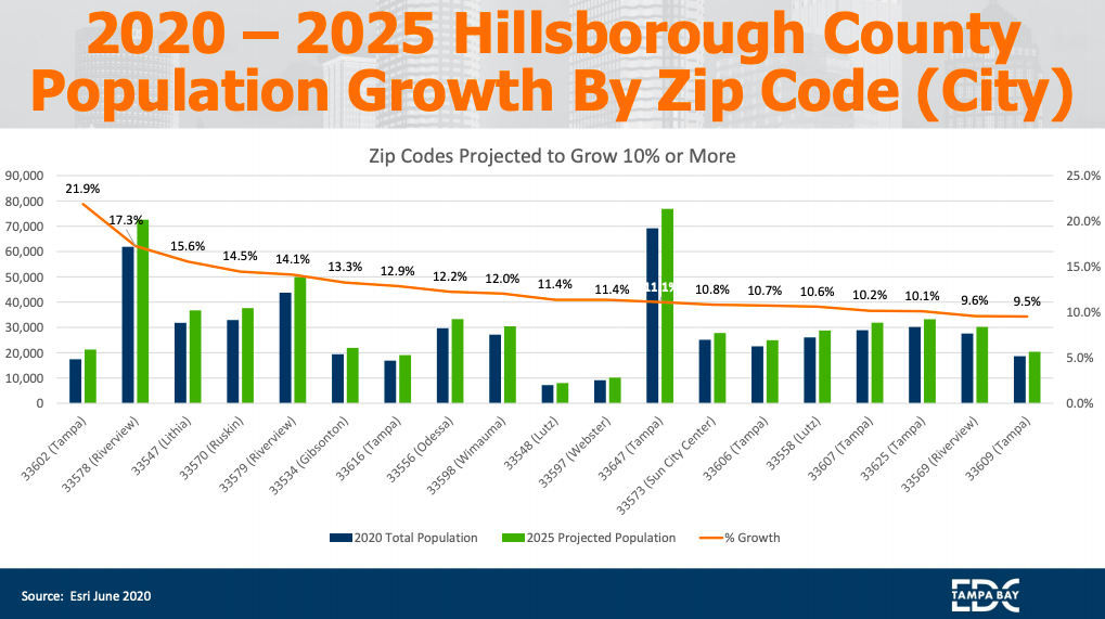 Tampa zip code 33647 continues to have the highest population density but lands at an approximate 11.19% rate of growth for the period.